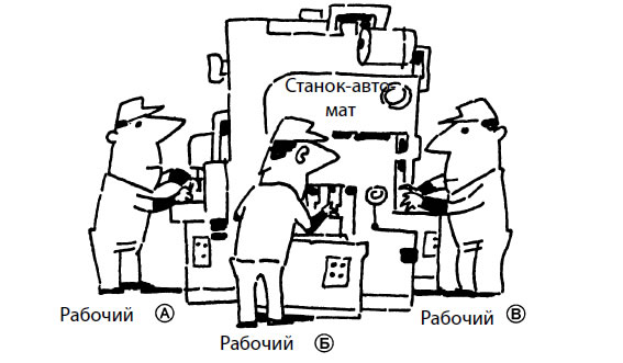 Второе, что нужно сделать для уменьшения числа занятых, – это продумать расстановку людей вокруг мощного станка-автомата. Из-за его размеров обслуживающих станок рабочих иногда расставляют на достаточно большом расстоянии друг от друга. Также в большинстве случаев все они выполняют операции, на которые уходит только часть времени такта. Поэтому вы должны приучиться задавать себе вопрос: «Нельзя ли поручить рабочему А ту работу, которую сейчас выполняет рабочий Б? И нельзя ли также передать работу, выполняемую рабочим Б, рабочему В?»