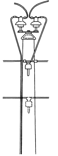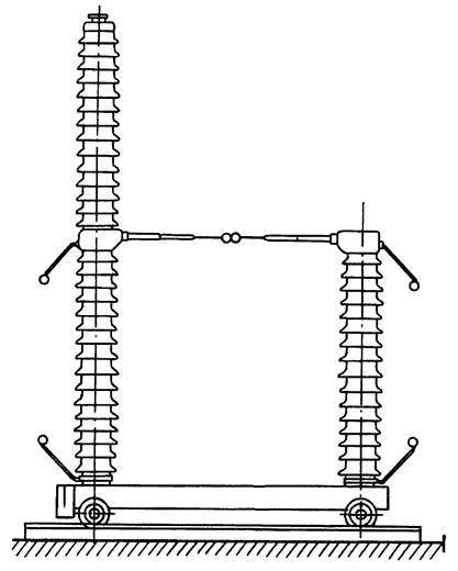 Первые разрядники были рассчитаны на защиту от атмосферных перенапряжений посредством искрового пробоя воздушного промежутка между двумя металлическими электродами. Такие электроды имели форму рогов, закрепленных на фарфоровых изоляторах (рис. 6.12). Такая форма электродов способствовала отводу от изоляторов электрической дуги, которая может возникать при пробое разрядника под воздействием молнии.