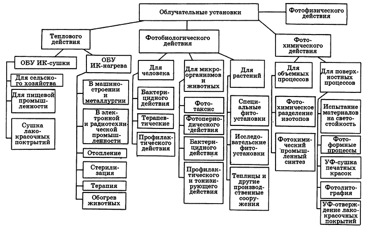 После второй мировой войны во многих странах и в нашей стране стали разрабатывать и серийно выпускать искусственные источники, генерирующие излучение в различных участках оптического диапазона спектра – ультрафиолетовом, видимом, инфракрасном. Это послужило одной из причин бурного развития в 50–70-е годы облучательных установок. Расчет и воплощение ОБУ базируются на методах, используемых в ОУ, однако требуют более детального изучения приемника и его реакции на излучение. На рис. 9.11 приведена схема областей применения ОБУ