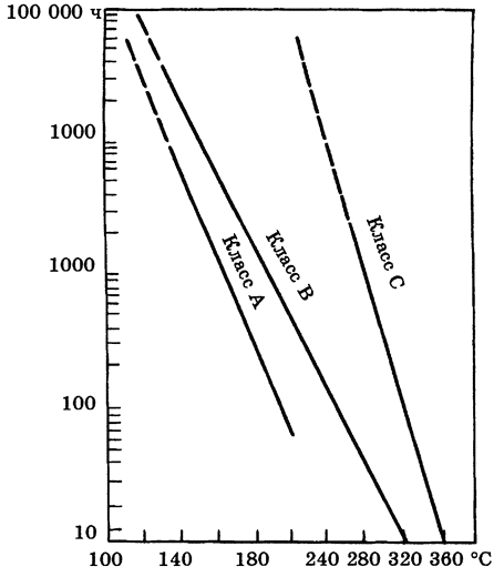 Рис. 10.1. Зависимость времени жизни изоляции классов А, В и С от температуры