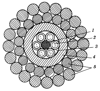 1 – центральный силовой элемент; 2 – оптическое волокно (свободной укладки); 3 – гидрофобный заполнитель; 4 – полимерная трубка; 5 – броня из стальных и алюминиевых проволок