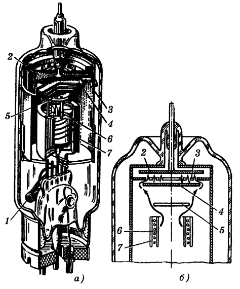 а – общий вид; б – разрез; 1 – генератор водорода; 2 – анод; 3 – сетка; 4, 5 – электрические экраны; б – катод; 7 – тепловой экран