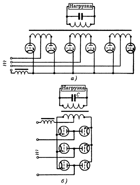 В области повышенных частот (от 500 Гц до 1–2 кГц) использовались преобразователи на игнитронах и экситронах производства ВЭИ с сеточным управлением (мощностью до 1000 кВт). Для улучшения условий работы преобразовательного оборудования практиковалось объединение нескольких преобразователей в так называемую преобразовательную станцию, которая в меньшей степени была подвержена воздействию технологической неравномерности энергии, потребляемой несколькими индукторами. После освоения промышленного выпуска тиристоров с улучшенными свойствами, в частности Таллиннского электротехнического завода, высокочастотные преобразователи выпускались на большие мощности по классическим схемам инверторов тока, а также по схемам с удвоением выходной частоты (рис. 11.10).