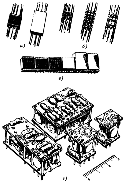 Первые типовые логические элементы создавались на основе транзисторно-резисторных, диодно-транзисторных, транзисторно-транзисторных ячеек (РТЛ, ДТЛ, ТТЛ), выполняемых из дискретных компонентов навесным монтажем или на печатных платах. Конструктивно они выполнялись в виде компактного параллелепипеда в пластмассовом корпусе, иногда залитого эпоксидной смолой (рис. 11.12). Монолитный брусок с набором внешних выводов имел хорошие механические свойства. Слабым местом устройств были внешние выводы и соединения. Проектирование логических устройств означало полное, исчерпывающее описание функционирования на языке булевой алгебры, приведение к выбранному элементному базису и схемотехническое (топологическое) проектирование.