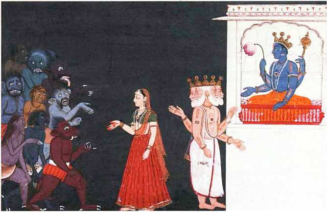 Рождение сумерек после потопа под взглядом Брахмы. Вторая половина XVII в. Индийская миниатюра; школа Пахари