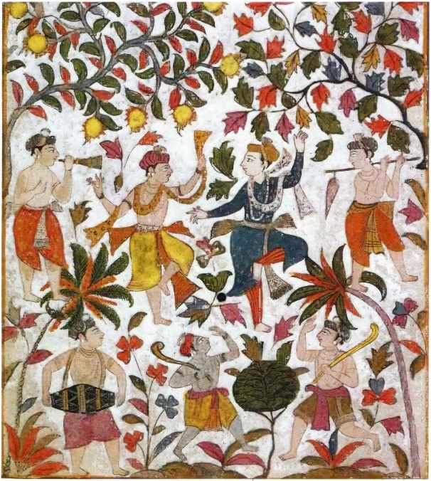 Музыканты и танцоры. Середина XVI в. Миниатюра из «Бхагавата-пураны»