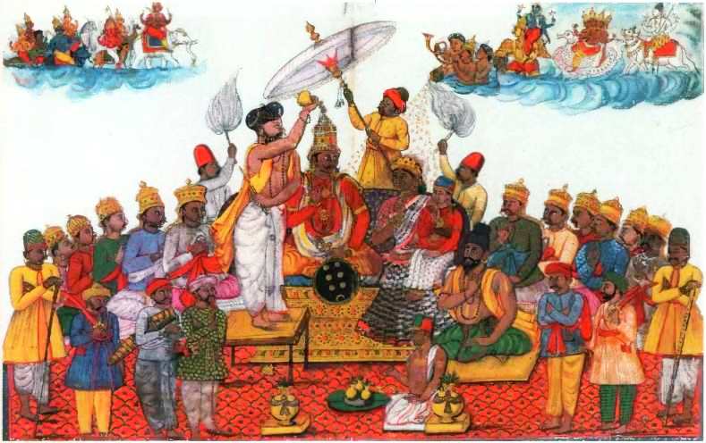 Индра, царь богов, помазан ведическим богом Сомой. XVIII в. Бумага, гуашь; индийская школа