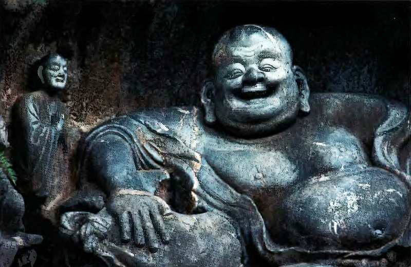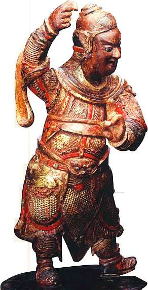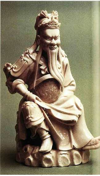 Это гигант с длинной бородой, пунцовым лицом и с бровями из шелковичных червей. Его изображают в латах и с алебардой либо без оружия, чешущим бороду одной рукой и держащим в другой сочинения мудрецов – последователей Конфуция. Реальный Чжань был продавцом сои. Он взял имя Гуань, когда пошел служить в армию. Потеряв руку в одном из сражений, он подвергся хирургической операции, чтобы вернуть ее на место. Присутствующие не верили своим глазам: в течение всей операции он раскладывал пасьянс одной рукой. Пленив его, вражеский император предложил ему перейти на его сторону либо умереть. Гуань-ди выбрал смерть и все оставшееся время поносил солдат-изменников.