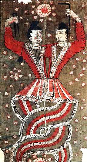 Фу-си и Нюй-гуа. Первая половина VIII в. Тушь и краски на конопляном холсте. Некрополь Астана, Турфан