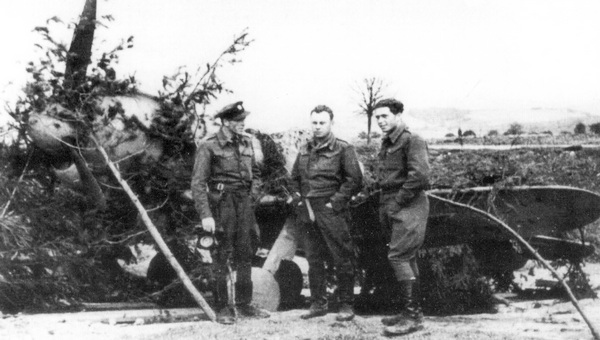 Три чехословацких пилота сфотографировались на фоне замаскированного Ла-5ФН на аэродроме Три Дуби. Слева направо: подпоручик Л. Валоушек, подпоручик Чабера и штаб-ротмистр А. Матушек.