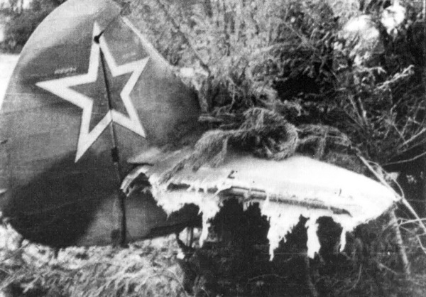 Ла-5ФН с/н 39212124 подпоручика С. Хлучека с отбитым во время победного боя рулем высоты, аэродром Три Дуби, 18 октября 1944 года. Обратите внимание на серийный номер, нанесенный над горизонтальными лучами звезды на киле.