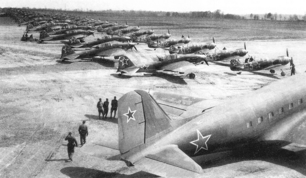 Парад 1-й чехословацкой смешанной авиадивизии на аэродроме Поремба 26 апреля 1945 года. Дуглас «Дакота» на переднем плане доставил делегацию чехословацкого правительства. Обратите внимание на разницу в размерах звезд на фюзеляже у машин позднего (б/н 53) и раннего (б/н 63) выпуска.