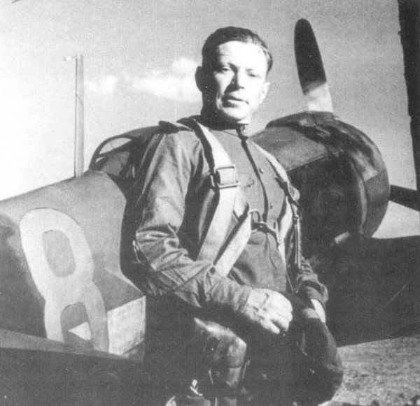Лейтенант П. Раков позирует на фоне Ла-5ФН с редким однозначным бортовым номером 8 желтого цвета и изображением молнии на борту (белого цвета).