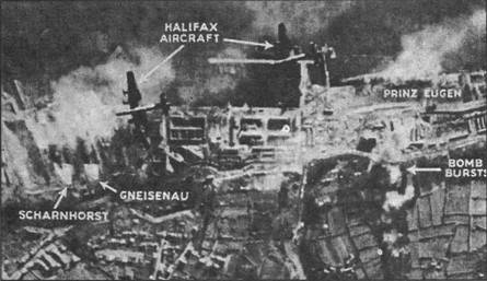 На снимке запечатлен налет бомбардировщиков «Галифакс» на немецкие корабли в Бресте. В 1941 г. стоявшие там линкоры «Шарнхорст» и «Гнейзенау» были главной целью Бомбардировочного командования, но из сброшенных на них 829 тонн бомб в цель попали только четыре бомбы…