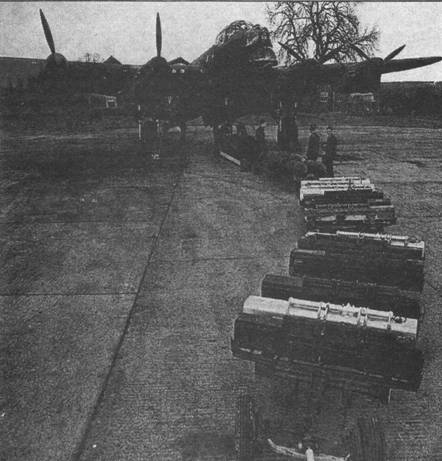 Постепенно были выработаны оптимальные варианты бомбовой нагрузки – в «Ланкастер»грузят одну 1800-кг бомбу («Куки»), четыре 454-кг бомбы и контейнеры с зажигательными бомбами
