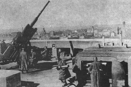Немецкое зенитное орудие ведет огонь по самолетам союзников. В 1944 г в зенитных частях ПВО Германии служили 900 тыс. человек. На вооружении состояло свыше 55 тыс. орудий.