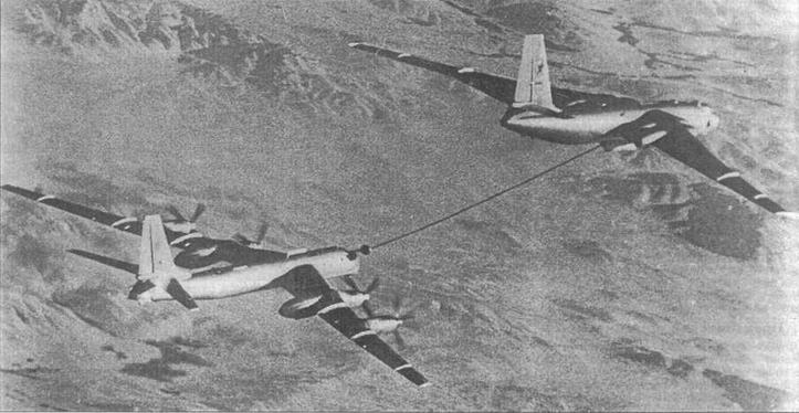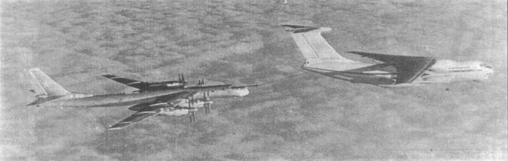 Первый Ту-95КМ поступил в 106-ю ТБАД 14 февраля 1963 г. С тех пор дозаправка в воздухе стала необходимым элементом боевой подготовки, освоить который должны были все летчики, в противном случае они уходили с “девяностопятых”. Процедура дозаправки, в ходе которой огромные Ту-95 и танкеры выполняли совместное маневрирование на дистанциях до 15 м, была очень сложной и утомительной. Один из ракетоносцев после окончания заправки проскочил вперед и килем распорол нижнюю часть фюзеляжа заправщика ЗМС-2. Несмотря на потерю трети киля, самолет успешно совершил посадку на своем аэродроме. В другом случае заправочный конус попал в плоскость винтов ракетоносца. Все восемь лопастей были срезаны на 20-40% размаха, кроме того, отказала система флюгирования, но Ту-95 также совершил благополучную посадку. В очень сложную ситуацию попал в 1985 г. экипаж командира 79-й ТБАД Степанова. Во время перекачки топлива шланг на заправщике оборвался, перехлестнул через кабину Ту-95, разбил один из блистеров и стал колотить по рулям, грозя катастрофой. Тогда командир принял решение отстрелить часть шланга из верхней установки, что и было сделано. С тех пор на заправку “девяностопятые” летают с полным боекомплектом верхних пушек. Несколько позже аналогичный случай произошел с Ту-95МС, экипаж которого, не имея средств отстрелить шланг, вынужден был садиться с такой помехой.