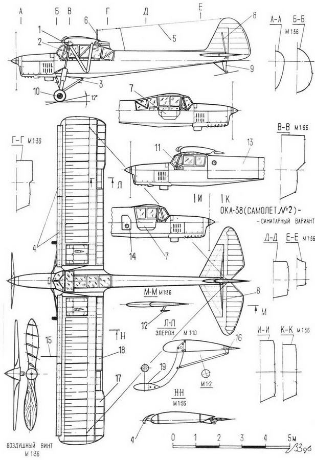 Конструкция ОКА-38 смешанная. Ферменный фюзеляж выполнен зацело с килем из стальных (ЗОХГСА) сваренных между собой труб. Каркас двухлонжеронного крыла и стабилизатора – деревянный. Обшивка везде полотняная, предкрылки – дюралевые. Прямоугольное в плане крыло имеет профиль ЦАГИ Р-IIc [** При исследовании “Шторьха" в СССР обнаружилось, что профиль крыла, элеронов и закрылков тождествен профилю Р-IIс, разработанному П. П. Красилыциковым и описанному в “Трудах ЦАГИ" №103 за 1932 г. (Использовался на планерах Антонова РФ-1, РФ-2 и РФ-3.) Из этого факта советской прессой в свое время была создана целая шпионская история “об украденном фашистами профиле", хотя аэродинамики всего мира считают подобные разработки чем-то вроде интернационального достояния.]. При отклонении щелевого закрылка в посадочное положение (40") элероны автоматически опускались на 15'. Конструкция узлов навески крыла позволяла складывать консоли на стоянке путем поворота их назад вдоль оси фюзеляжа. Стабилизатор переставной с изменяемым в полете углом установки. Для сохранения эффективности рулей высоты при больших отклонениях вверх на их нижней поверхности под небольшим отрицательным углом устанавливались дюралевые подкрылки.