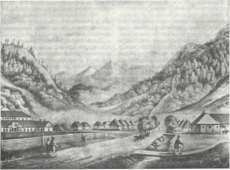 Вид солеварни в с. Манява Станиславского округа. Середина XIX в. Литография с картины А. Ланге