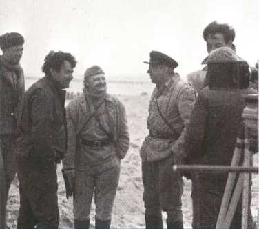Режиссер Алексей Герман (второй слева), Михаил Кононов и Юрий Никулин (третий справа) во время съемок фильма "Двадцать дней без войны)