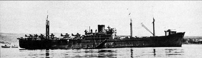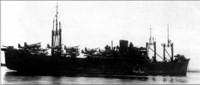 Слева: две фотографии «Кимикава– мару» на якорной стоянке, 1943 г. На кормовой палубе корабля размещены 8 гидросамолетов-корректировщиков тип 0 и 2 гидросамолета-истребителя тип 2, предназначенные для переброски на остров Атту