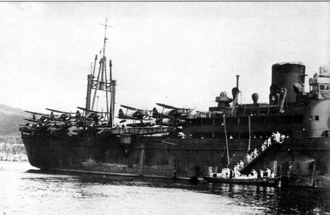 «Камикава-мару» с гидросамолетами-истребителями тип 2 и гидросамолетами-корректировщиками тип 0 на борту, 1943 г.