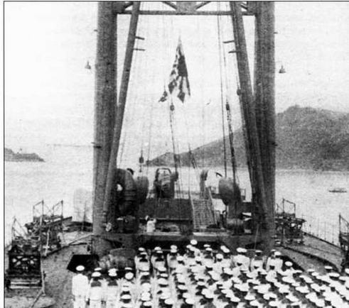 Церемония подъёма флага на «Кимикава-мару». На фото можно рассмотреть, что кормовая 15-см АУ не имеет щита