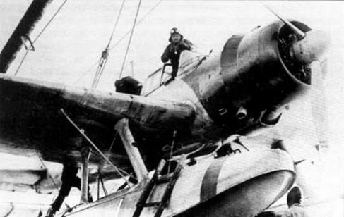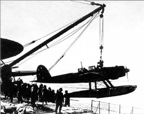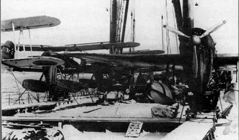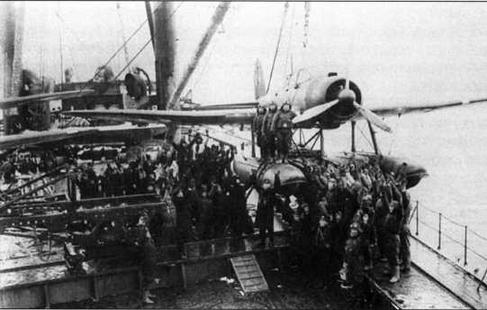 Справа: подъём на борт гидроавианосца «Кимикава-мару» возвратившегося с задания гидросамолёта-разведчика тип 0 с бортовым номером Х-5 (красного цвета). На поверхности воды видны многочисленные мелкие льдинки. Поскольку самолётам приходилось действовать непосредственно у границ СССР (а иногда и над территорией СССР), с которым в то время был подписан договор о ненападении, то из-за опасения дать СССР повод для недовольства знаки государственной принадлежности были закрашены светло-серой краской.