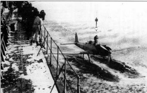 Спуск на воду гидросамолёта-разведчика тип 0 (скорее всего, с бортовым номером Х-5) с борта гидроавианосца «Кимикава– мару» грузовой стрелой, мотор самолёта уже запущен. Январь-февраль 1942 г.