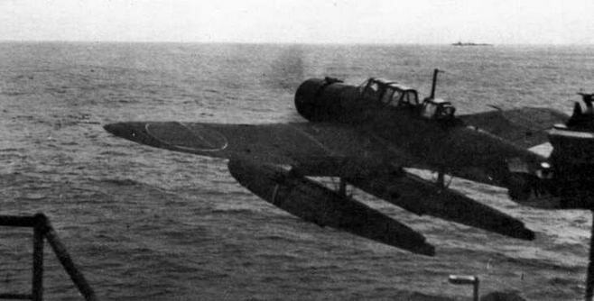 Вверху: старт гидросамолёта-разведчика тип 0 с катапульты гидроавианосца «Кимикава-мару», в 250 милях от острова Кыска, 11 мая 1942 г. В глубине снимка справа можно различить силуэт крейсера 2-го класса «Кисо»