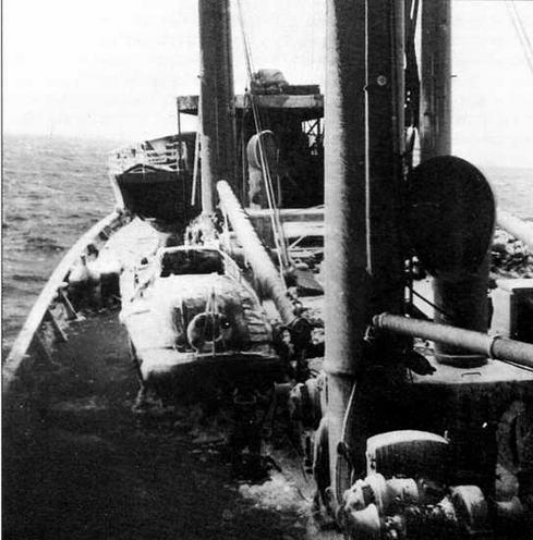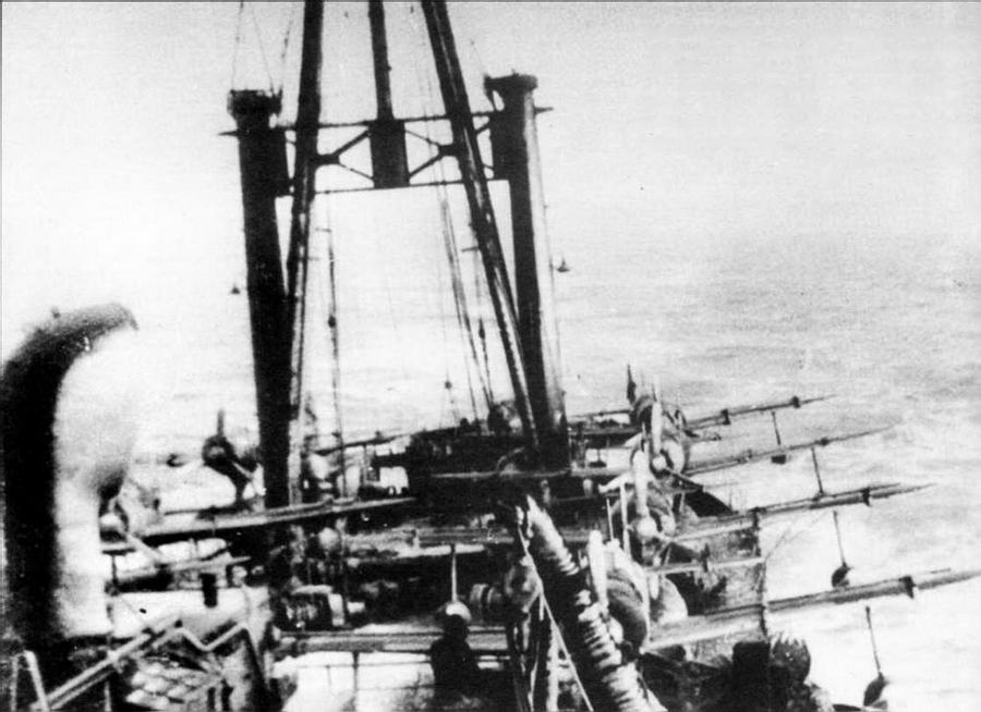 Кормовая палуба «Кимикава-мару» на переходе морем на остров Атту, зима 1943 г. Хорошо видно обледенение палубы, авиационного оборудования и гидросамолётов