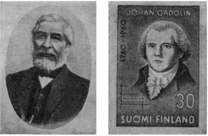 Профессор химии швейцарский ученый Жан Шарль Галиссар де Mариньяк (1817–1894) был видным теоретиком и экспериментатором. Он занимался определением и уточнением атомных весов и реакционной способности элементов, исследовал озон, вольфрамовую кислоту, производные нафталина… Наибольшую известность Мариньяку принесло открытие в 1880 г. нового редкоземельного элемента гадолиния. На правом рисунке – почтовая марка, выпущенная в Финляндии в 1960 г. в честь 200-летия со дня рождения одного из первых исследователей редких земель Юхана (Иоганна) Гадолина. В ее левом нижнем углу воспроизведена клетка элемента № 64 в таблице Менделеева