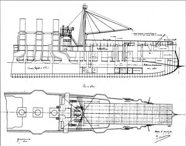 После перелета Луи Блерио через Ла-Манш в июле 1909 года, и полета Анри Фабра на первом в мире гидросамолете "Канар" в марте 1910 г. французский флот стал выказывать интерес к авиации. В апреле 1910 года, по распоряжению морского министра адмирала Буэ де Лапейрера, была создана комиссия по авиации. По итогам ее заседаний было сочтено, что аэропланам следует отдать предпочтение перед дирижаблями, и что аэропланам можно поручить обнаружение подводных лодок и миноносцев, а также атаку кораблей противника при помощи бомб. Также предлагалось переоборудовать в авианосец корабль большого водоизмещения, имеющий рельсы для запуска самолета в носу, платформу для посадки самолета в корме и ангар в средней части.