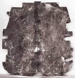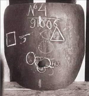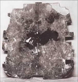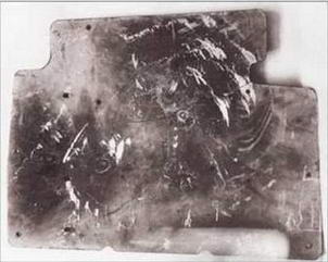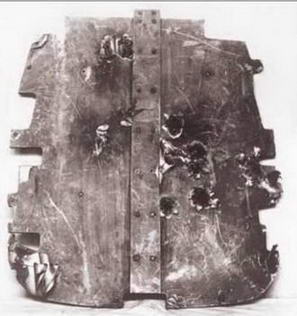 Слева: стальная броня толщиной 10 мм, установленная за бензобаком, после обстрела системы «дюралевая броня – бензобак» (сторона, обращенная к хвосту самолета). Хорошо видны места, опаленные зажигательным составом пули после прохождения сквозь многослойную дюралевую броню и бензобак. В центральной части бронелиста видны трещины после третьего попадания. Выше над трещиной заметен отпечаток пули калибра 12,7 мм, попавшей в броню плашмя (четвертое попадание). В верхней правой части плиты видна пробоина (пятое попадание). Справа: тыльная стороны плиты. Обратите внимание на трещины.