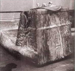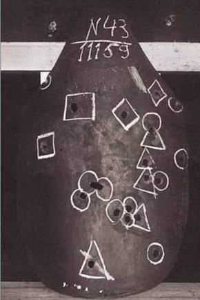 Бензиновый бак Bf109G-2 после обстрела бронебойно-зажигательными пулями калибра 12,7 мм с дистанции 100 м. Кружками обведены входные отверстия пуль.