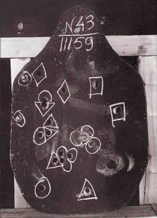Характер поражения экрана составной брони с лицевой стороны (слева) и с тыльной стороны (справа) при стрельбе с дистанции 100 и 200 м по нормали и под углами 20, 25 и 30° (круг – 200 м по нормали, треугольник – 100 м, 30°, квадрат – 100 м, 25°, ромб – 100 м, 20°). Государственные испытания на заводе №207, август 1943 г.