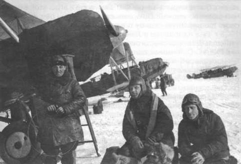С.С. Ячменев (в центре) с летнабом и авиатехником возле Р-5Ш. Красноярск, зима 1934-35 годов