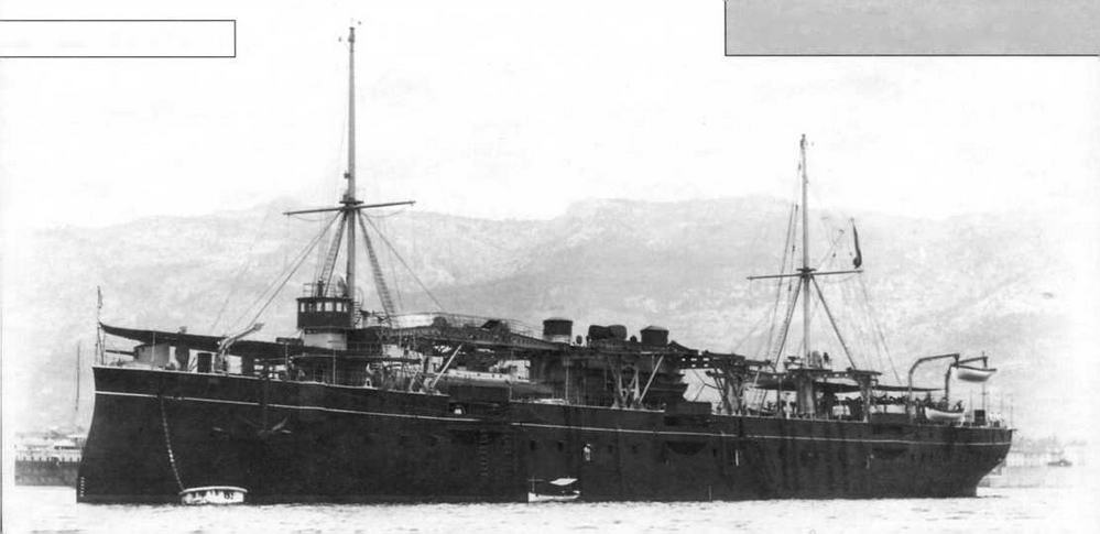 «По оценке, водоизмещение эскадренного транспорта достигнет 5557,476 т, длина между перпендикулярами – 107,.90 м. Корабль устроен так, что сможет нести 10 18-м миноносок водоизмещением 12 т.
