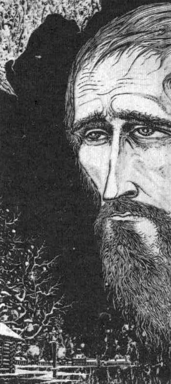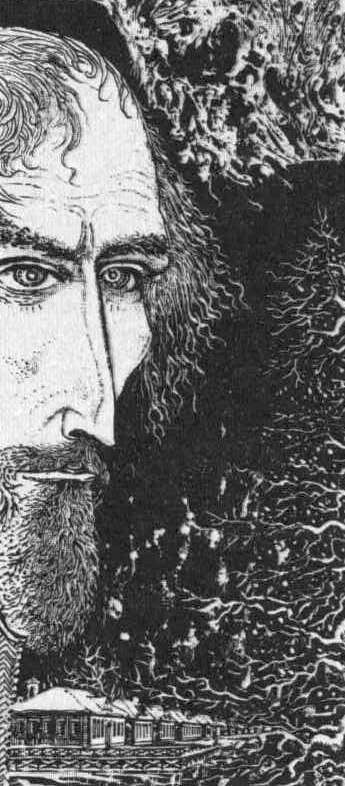 Он был страшен. Сверх изорванного во время припадка в клочья серого платья куртка из грубой парусины с широким вырезом обтягивала его стан; длинные рукава прижимали его руки к груди накрест и были завязаны сзади. Воспаленные, широко раскрытые глаза (он не спал десять суток) горели неподвижным горячим блеском; нервная судорога подергивала край нижней губы; спутанные курчавые волосы падали гривой на лоб; он быстрыми тяжелыми шагами ходил из угла в угол конторы, пытливо осматривая старые шкапы с бумагами и клеенчатые стулья и изредка взглядывая на своих спутников.