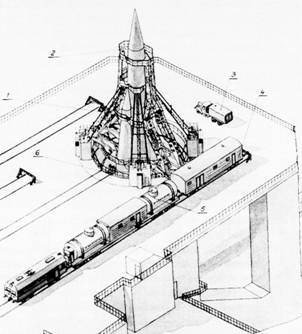 1 – стартовая система 8У0215; 2 – фермы обслуживания 8Т0119; 3 – обмывочно-нейтрапизационная машина; 4 – заправщик перекеси водорода; 5 – заправщик горючего; 6 – опорная ферма.