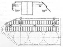 Проработка такой схемы броневой защиты для плавающего танка ПТ-76 была выполнена в конструкторском бюро СТЗ под руководством С.А. Федорова, которая подтвердила возможность ее использования для верхней части бортов (надгусеничных ниш) корпуса. В этом случае наружный верхний броневой лист борта корпуса приобретал функции первой преграды. Вторая преграда устанавливалась как дополнительный конструктивный элемент и ограничивала внутренний объем корпуса. Для сохранения требований габарита по ширине и определенного водоизмещения угол наклона наружного бортового броневого листа корпуса должен был быть не более 15–20° от вертикали. Второй (внутренний) броневой лист мог быть оставлен вертикальным как продолжение нижней части борта. Кроме того, такое решение, помимо повышения уровня защиты, обеспечивало и повышенную жесткость корпуса танка без применения специальных опор (пиллерсов). В результате использования такой схемы броневой защиты расстояние между наружным и внутренним броневыми листами составляло около 300 мм, что было достаточным для рассредоточения осколков разрушенного сердечника пули. Во избежание заполнения водой межброневого пространства при пробитии наружного броневого листа, оно заполнялось легким водонепоглощающим материалом (пенопласт марки ПС-4). По результатам проведенных испытаний макетов броневой защиты борта плавающего танка ПТ-76 толщина второго броневого листа должна была составлять 10–12 мм. Разработанная духпреградная броневая защита с суммарной толщиной броневых листов 19 мм при установке первого листа под углом 15° от вертикали обеспечивала защиту от бронебойных пуль калибра 14,5 мм со всех дистанций и под всеми курсовыми углами. Необходимо отметить, что однослойная броня средней твердости толщиной 35 мм не могла обеспечить эту стойкость даже при угле наклона от вертикали 20°.