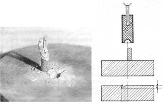 Справа: схема подрыва кумулятивного заряда на стержне.