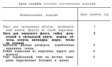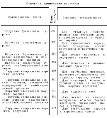 Парусина на кораблях и вспомогательных судах Военно-Морского Флота используется для пошива чехлов на боевую технику и плавсредства; из нее шьются: паруса, пластыри, угольные мешки, сигнальные шары, подвесные койки, парусиновые чемоданы и другие предметы (табл. 7.1). Парусина вырабатывается в виде полотнищ шириной от 70 до 130 см и длиной от 25 до 35 м. В зависимости от толщины парусина имеет различную крепость и вес (табл. 7.2).
