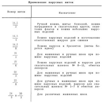 Парусные нитки для шитья парусины изготовляются из льняной вареной пряжи. Согласно ГОСТ парусные нитки различают по номеру, обозначаемому дробью: числитель показывает номер пряжи, знаменатель – число нитей пряжи в нитке (4,5/6 – нитка скручена из 6 нитей пряжи № 4,5). Номер пряжи показывает, сколько метров пряжи или каболки содержится в мотке весом 1 г. Таким образом, чем больше номер нитки, тем она тоньше. Для предохранения от вредного воздействия сырости нити пропитывают тиром, состоящим из пяти частей такелажного сала и трех частей воска или из пяти частей пчелиного воска, четырех частей ХЛОПКОЕОГО масла и одной части древесной смолы. Правильно составленный тир придает нитке светло-коричневый цвет. Для сшивания парусины артикулов 392, 391 и 385 (табл. 7.1) используют парусную нитку в 5–6 нитей. Для шитья более легкой парусины применяют двойную нитку в 4–3 нити; для ревентуха* – двойную нитку в 3 нити или одинарную в 6 нитей.
