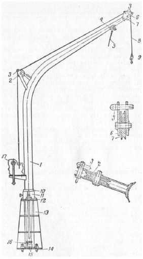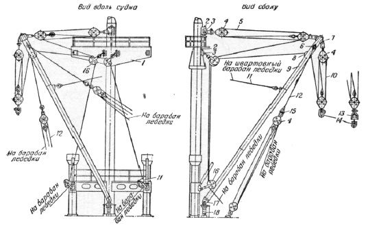 1 – салинг; 2 – башмаки; 3, 6, 7 – обухи; 4 – двухшкивные блоки; 5 – топенант-тали; 8 – врезной шкив, 9 – стрела; 10 – грузовые тали; 11 – гордень; 12 – бакштаги (оттяжки)– 13 – вертлюжная подвеска; 14– грузовая скоба; 15 – такелажная скоба; 16 – направляющий блок; 17 – вилка шпора стрелы; 18 – сварной фундамент