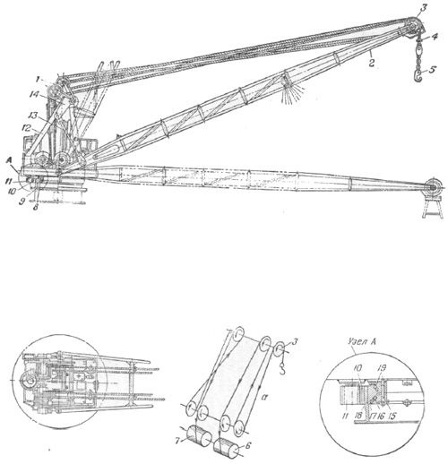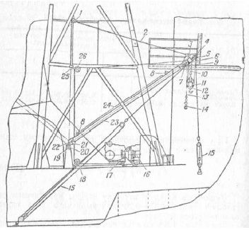 1 – обух; 2 – топенант: 3 – ось; 4 – шкив; 5 – обушок; 6 – шкив грузового шкентеля; 7 – ось шкива; 8 – зажимы для троса; 9 – обойма; 10 – двухшкивные тали; 11 – карман для нижнего блока грузовых талей; 12 – одношкивный блок; 13 – шкентель; 14-гак; 15 – бакштаги (оттяжки); 16 – лебедка; 17 – грузовой барабан лебедки; 18 и 26 – канифас-блоки; 19 – шпор; 20 – вертлюг; 21 – вилка; 22 – штырь; 23 – стрела; 24 – кожух стрелы;. 25 – обойма