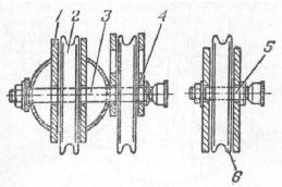 1, 4 – обоймы; 2, 6 – шкивы; 3, 5 – оси шкивов
