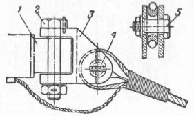 1 – обух; 2 – болт; 3 – скоба; 4 – ось крепления на мачте; 5 – ось крепления у нока стрелы
