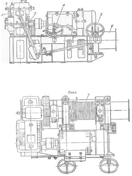 1 – рукоятка переключения муфты редуктора; 2 – рукоятка ручного привода; 3 – рычаг переключения муфт сцепления; 4 – ленточный тормоз грузового барабана; 5 – ленточный тормоз консольного барабана; 6 – консольный барабан; 7 – грузовой барабан