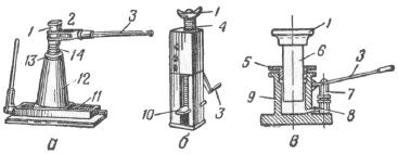 а – винтовой; б – реечный; в – гидравлический;1 – головка; 2 – трещотка; 3– ручка; 4 – рейка; 5 – сальник; 6 – поршень; 7 – насос. 8 – кран; 9 – цилиндр; 10 – лапа; 11 – каретка; 12-станина; 13 – гайка; 14 – винт